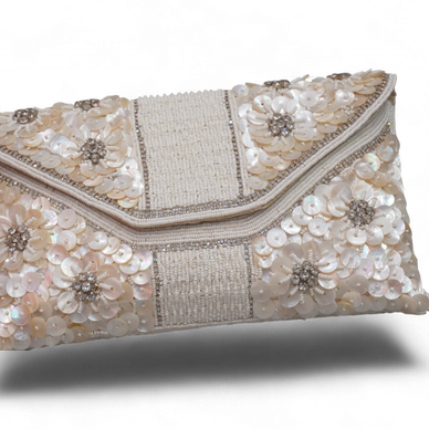 Elevate your evening look with this exquisite ivory clutch, adorned with shimmering sequins, delicate beads, and floral motifs for a timelessly elegant touch. Handcrafted with precision, this statement accessory adds glamour to any outfit — from wedding ensembles to cocktail dresses. The envelope-style design with a secure magnetic closure offers both sophistication and practicality, making it perfect for carrying your essentials in style.