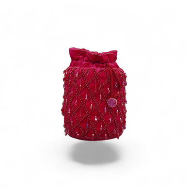 Handcrafted in rich ruby velvet, this cylindrical potli features an all-over diamond trellis of tone-on-tone beads with tiny sequins for a soft sparkle. A secure drawstring is finished with a beaded charm for an elegant touch. Compact yet practical—fits a phone, cards, keys and lipstick—making it a chic companion for weddings, sangeet nights and fe